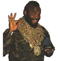 This page is dedicated to the finer things in life, the great pursuits of modern culture. That is to say Mr. T and Malt Liquor. We claim to be always adding things, but the truth is we're really lazy and would rather just come up with good ideas instead of actually doing anything about it. My point is, sooner or later something new will be added, but it'll be when I'm damn good and ready. In the meantime, check out the links that do work and if you don't like it you can send me an e-mail and I'll promptly send you a defensive and vitriolic reply questioning both your intelligence and taste.